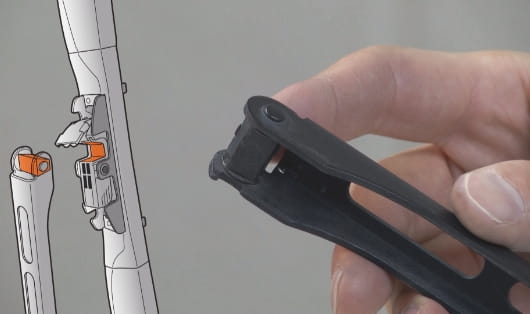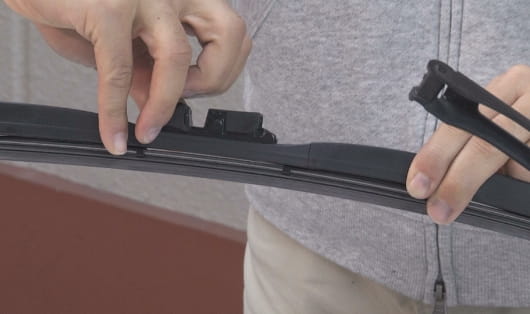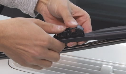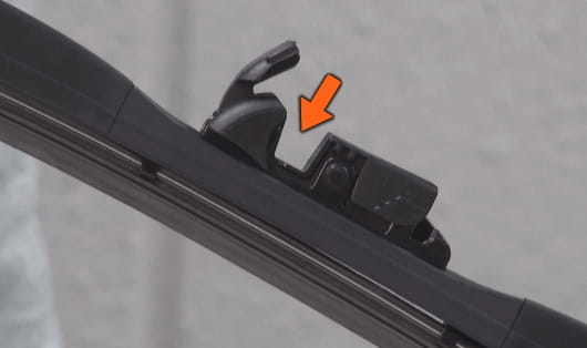 將接頭塞進雨刷臂的 U 形勾內。 無論汽車是右駕或左駕型,接頭的先端都是對著雨刷臂的先端。