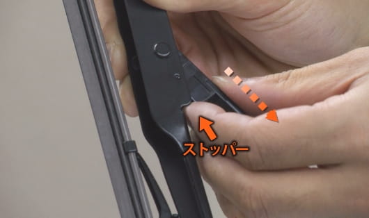 將接頭塞進雨刷臂的 U 形勾內。 無論汽車是右駕或左駕型,接頭的先端都是對著雨刷臂的先端。